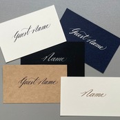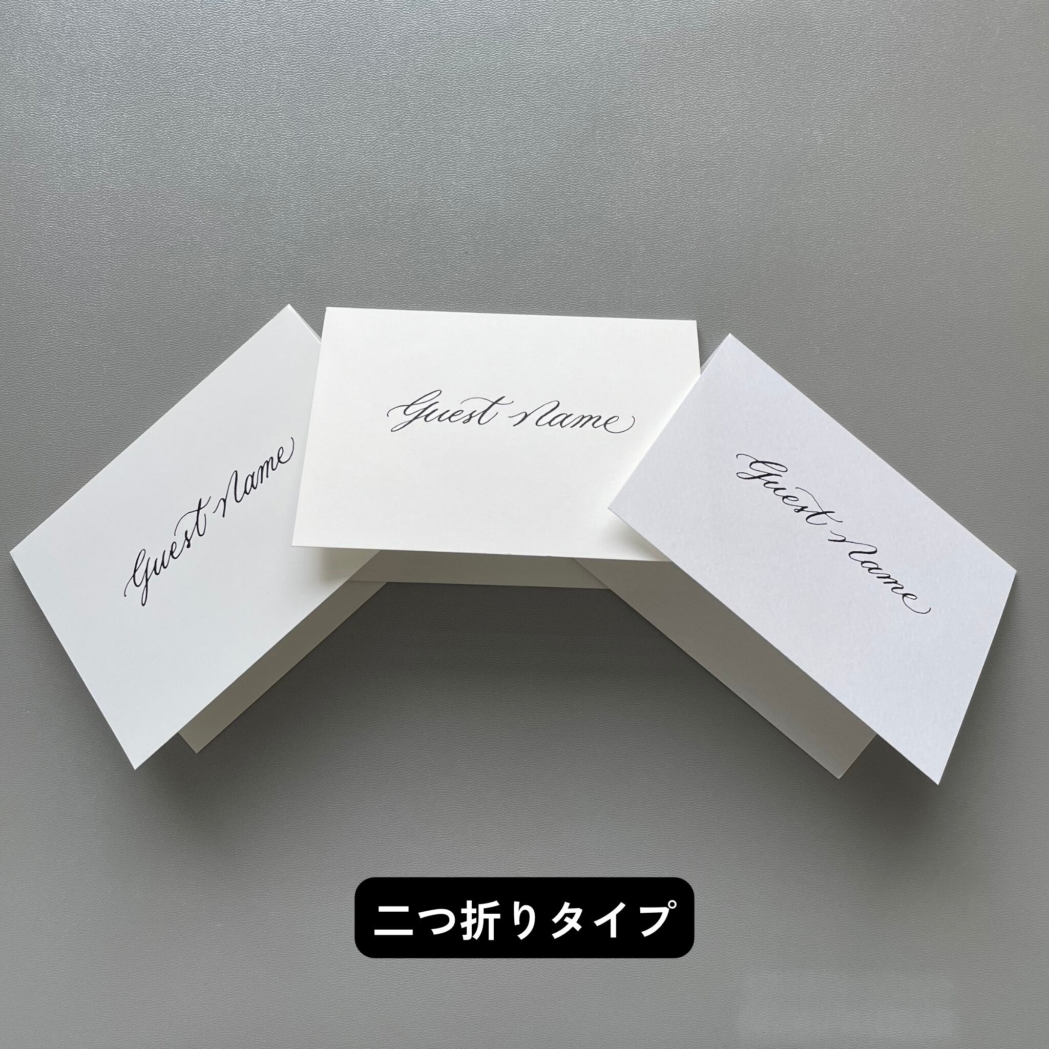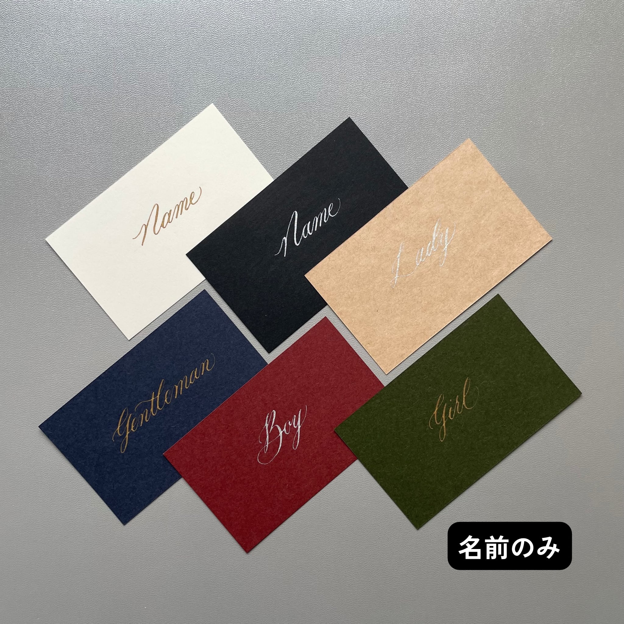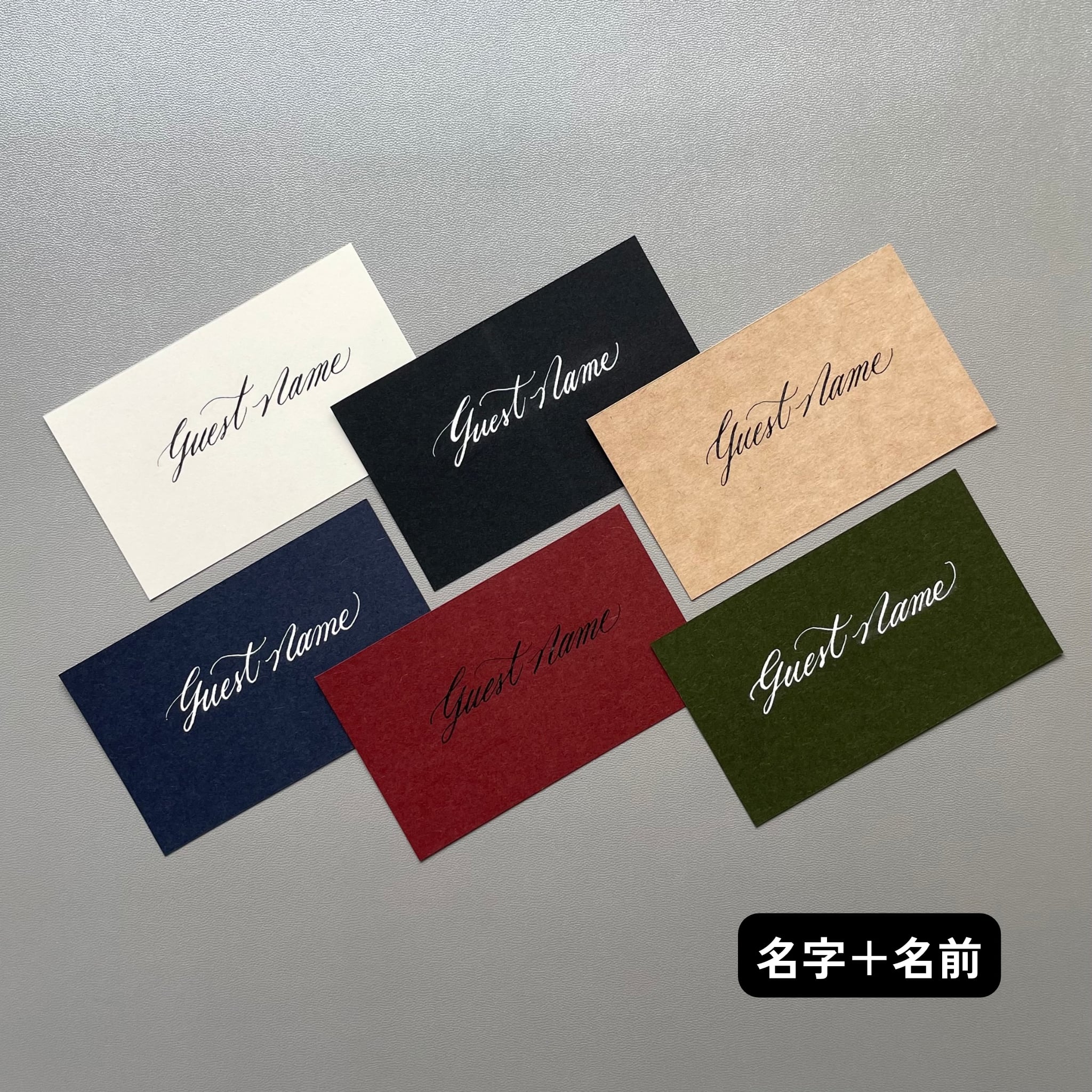 モダンカリグラフィーで製作した席札です。耐水性のインクを使用しているため、パーティーシーンでも安心です。ブランドや会社のレセプション等、ウェディング以外の用途でもお使いいただけます。