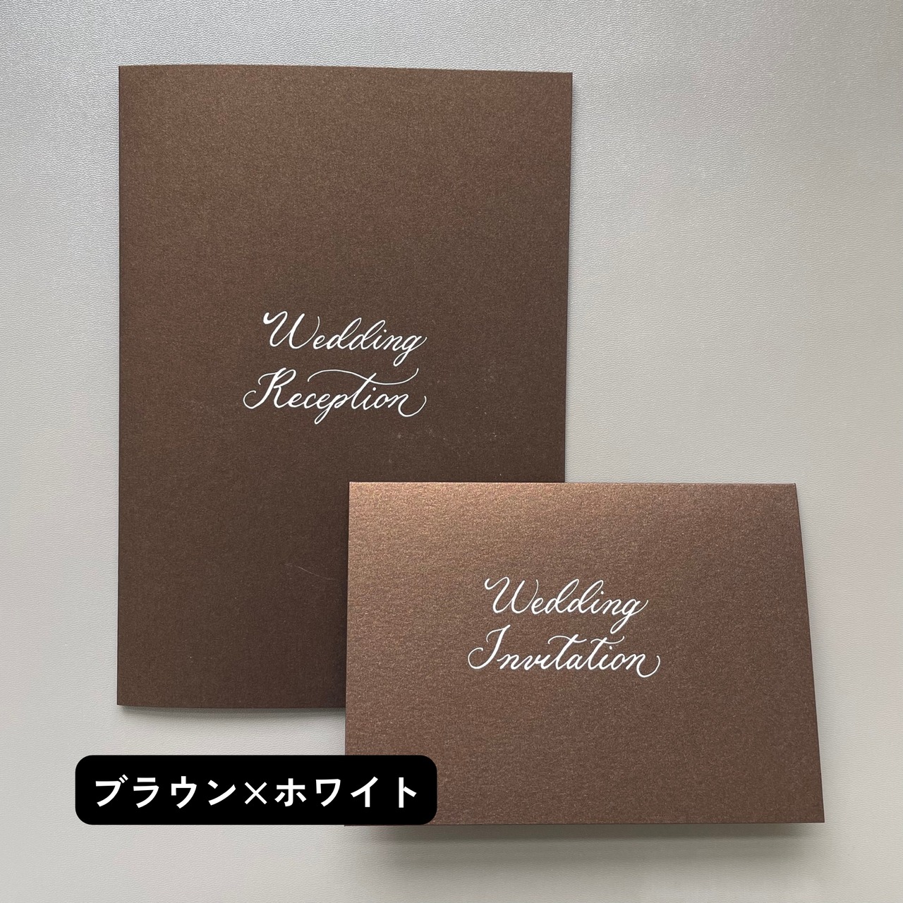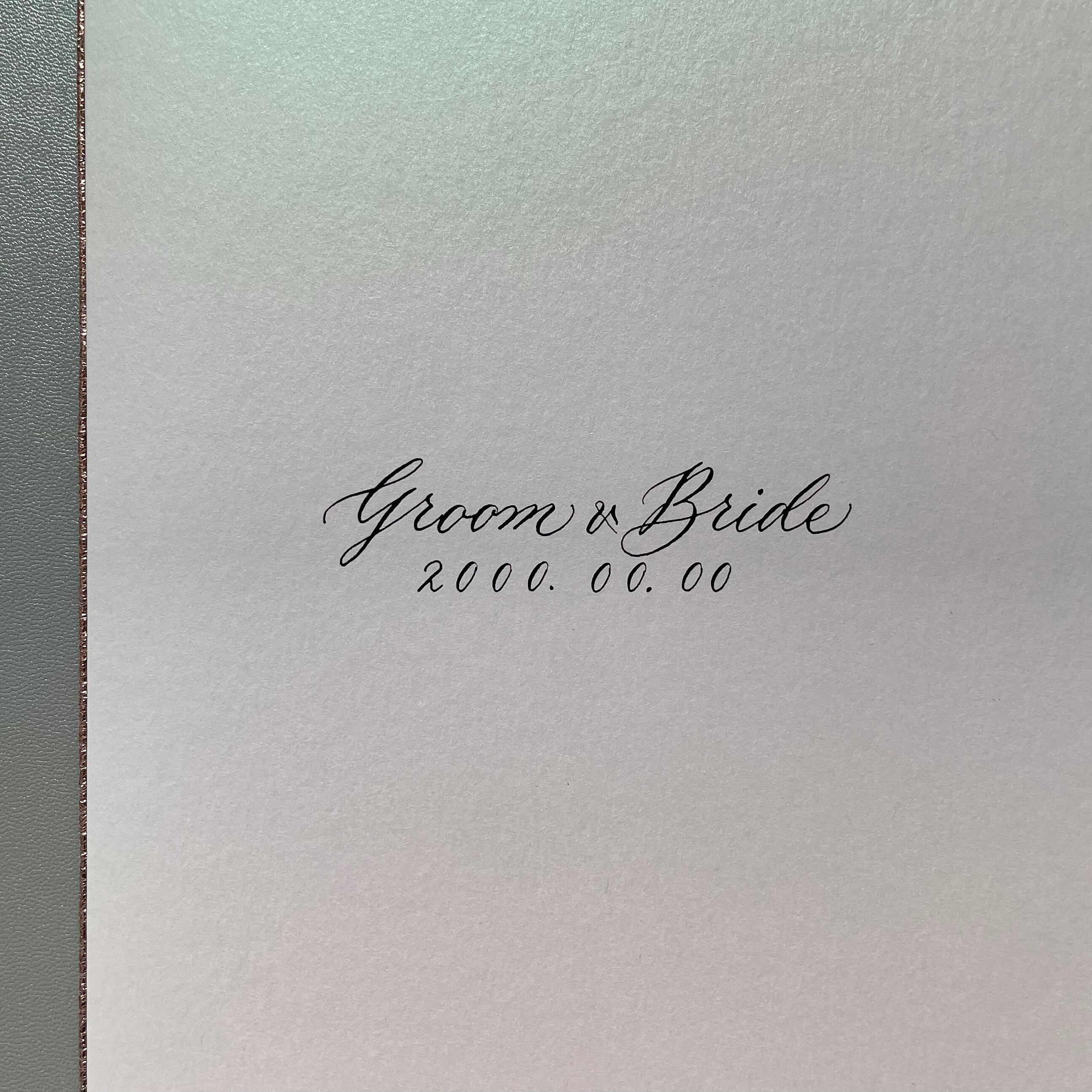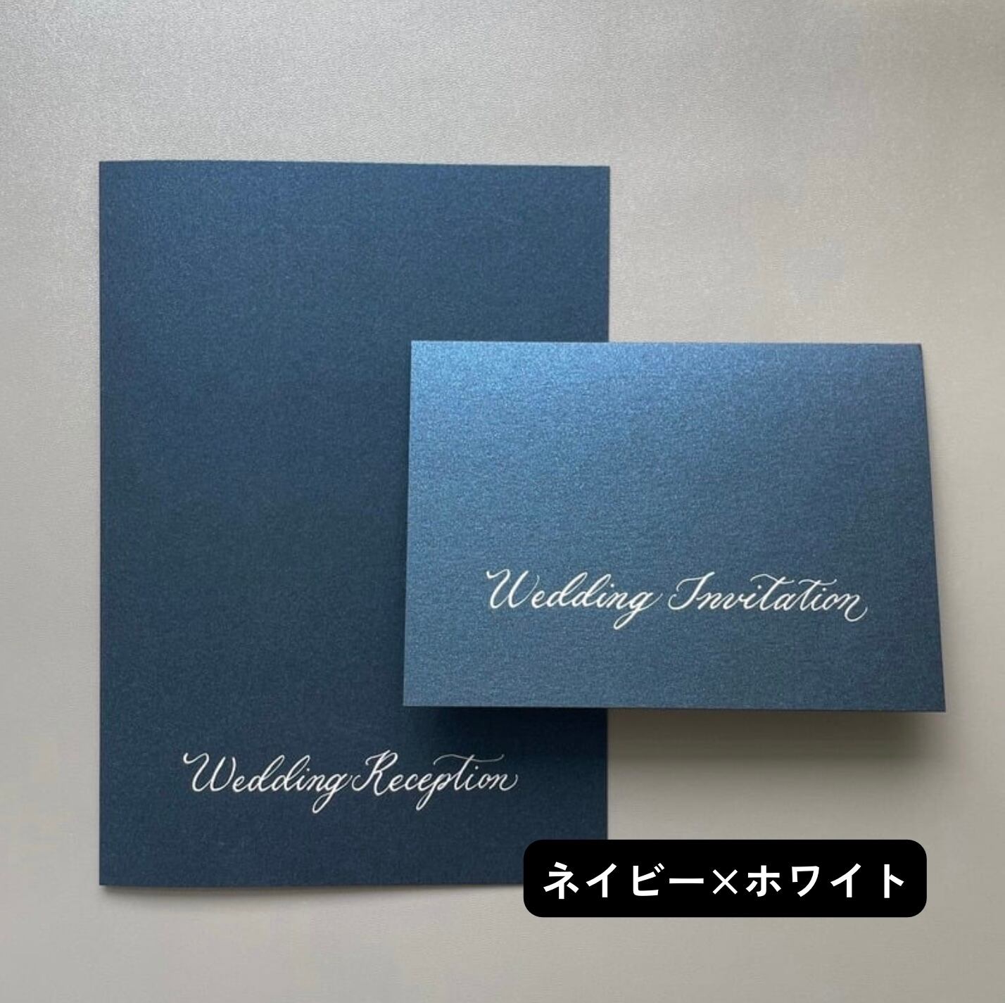 モダンカリグラフィーで表紙に手書きで文字入れした招待状です。耐水性のインクを使用しているため、パーティーシーンでも安心です。ブランドや会社のレセプション等、ウェディング以外の用途でもお使いいただけます。