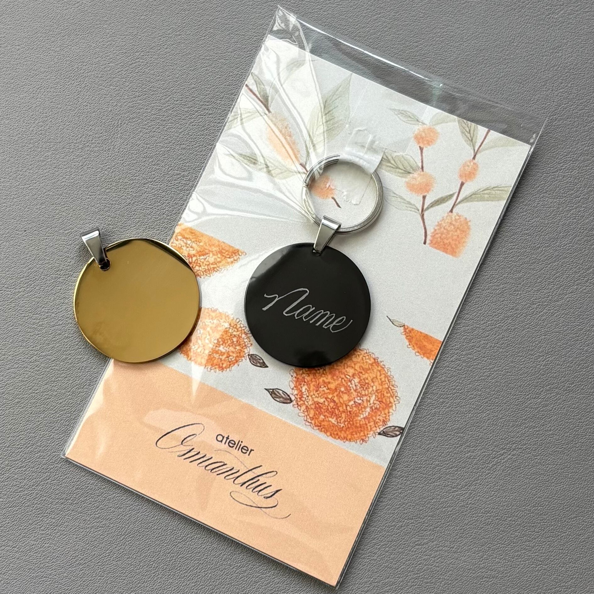 裏面の内容(特にご希望がなければお名前のイニシャルをお入れします)や名入れの位置、文字の向きもご自由にお選びいただけますので、ご希望があればお知らせください。