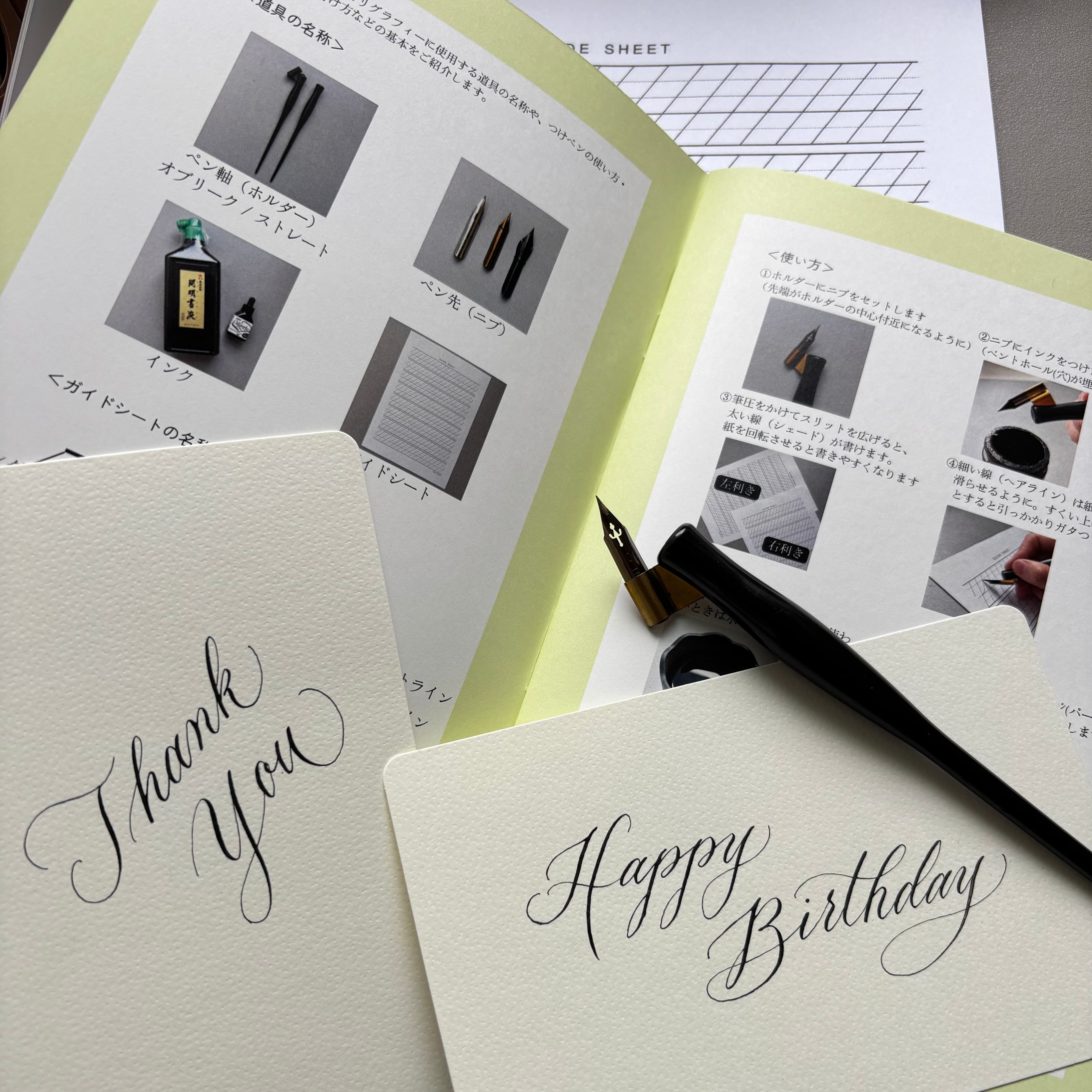 ※お道具はレンタル可能です。ご希望があれば3000円にて購入もできます(お道具セットのページよりご購入いただいた場合はレッスン当日にお渡しします)。つけペンの扱いが難しい場合は、筆ペンでの受講に切り替えることも可能です。